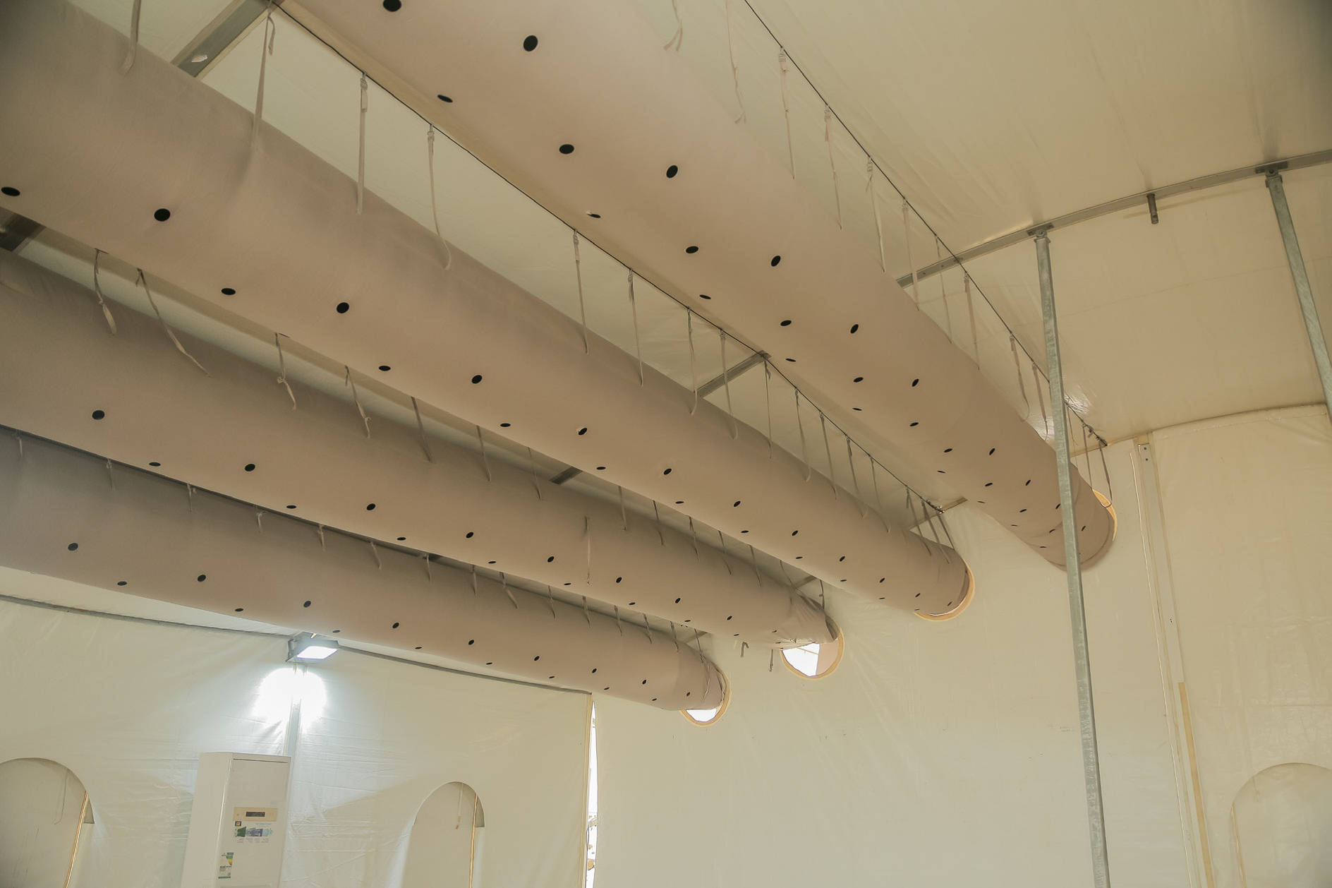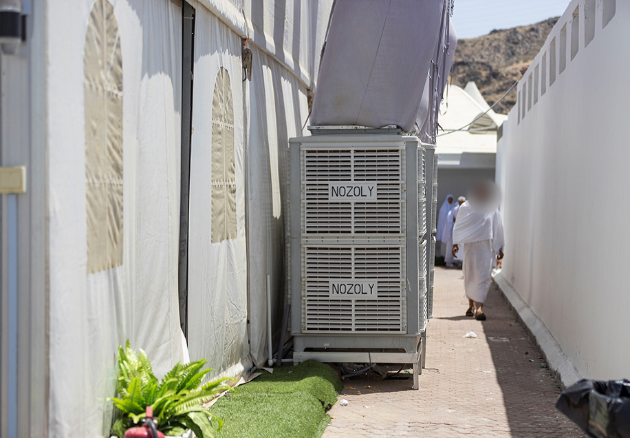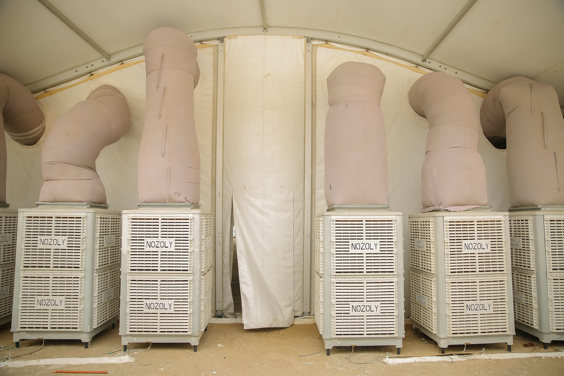مكيفات صحراوية مطورة تضخ ألف متر مكعب في الساعة، مدعمة بدكتات تمتلك كفاءة توزيع الهواء في جميع أنحاء الخيمة، فيها وحدات لتبريد المياه قبل دخولها إلى المكيف تصل إلى 4 درجات