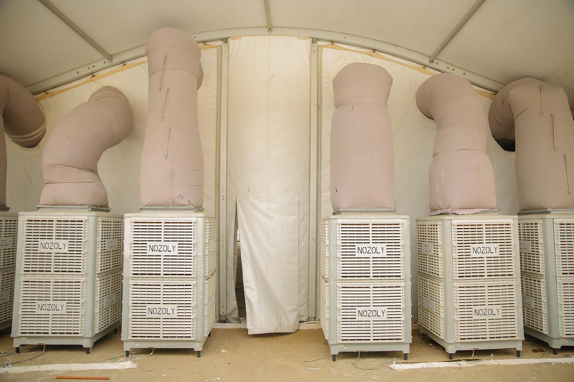 Advanced desert air conditioners that pump a thousand cubic meters per hour, supported by ducts that efficiently distribute air throughout the tent.